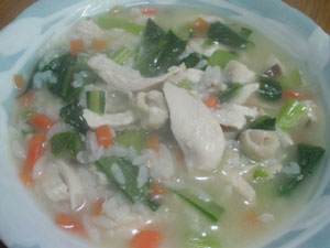 材料・・・鶏肉、人参、じめじ、こまつな、ご飯、かつおだし。
