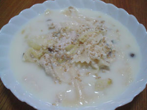 材料を食べやすい大きさに切って、お湯とスキムミルクを5/5の割合で加えやわらかくなるまで煮る。