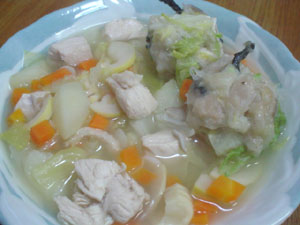 材料・・・鶏肉、人参、じめじ、こまつな、ご飯、かつおだし。